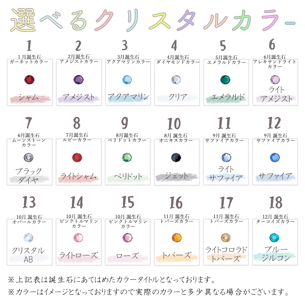 ご希望のクリスタルカラー番号をクリスタルカラー一覧よりご確認いただき正面左から順にご入力くださいませ。