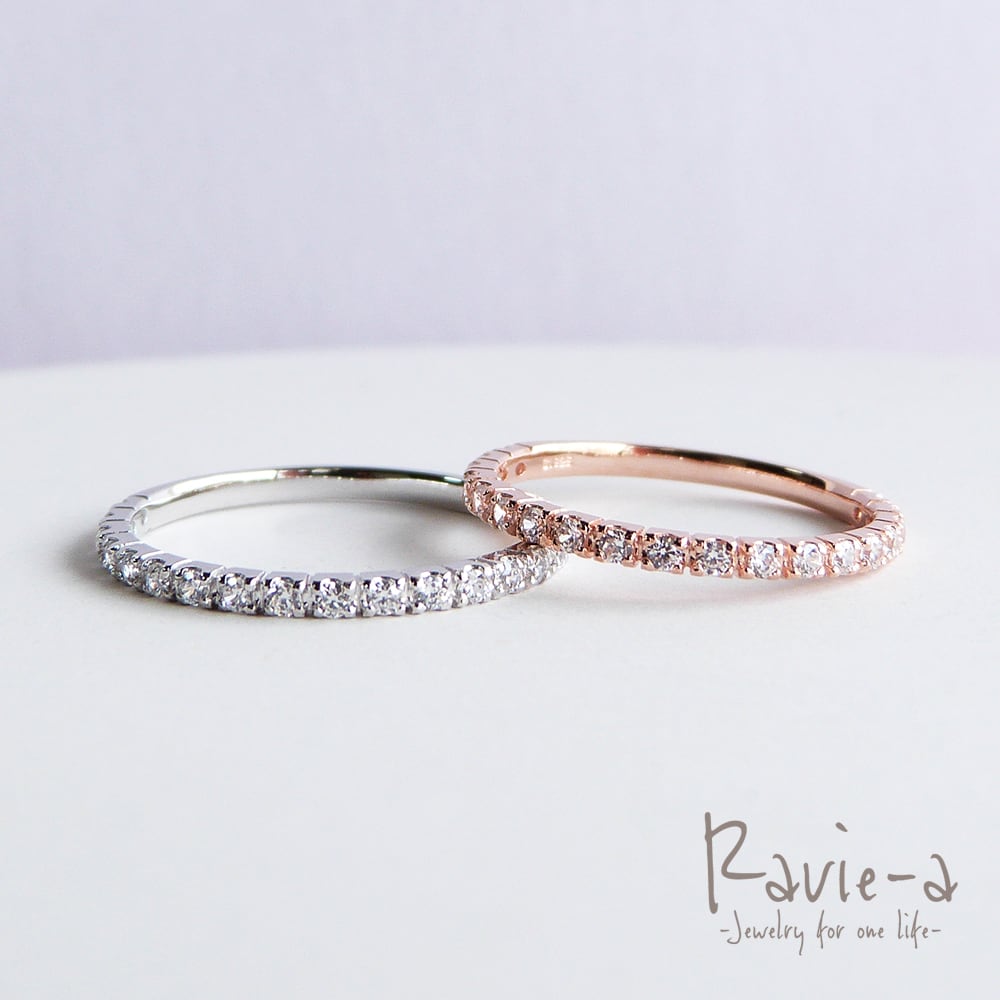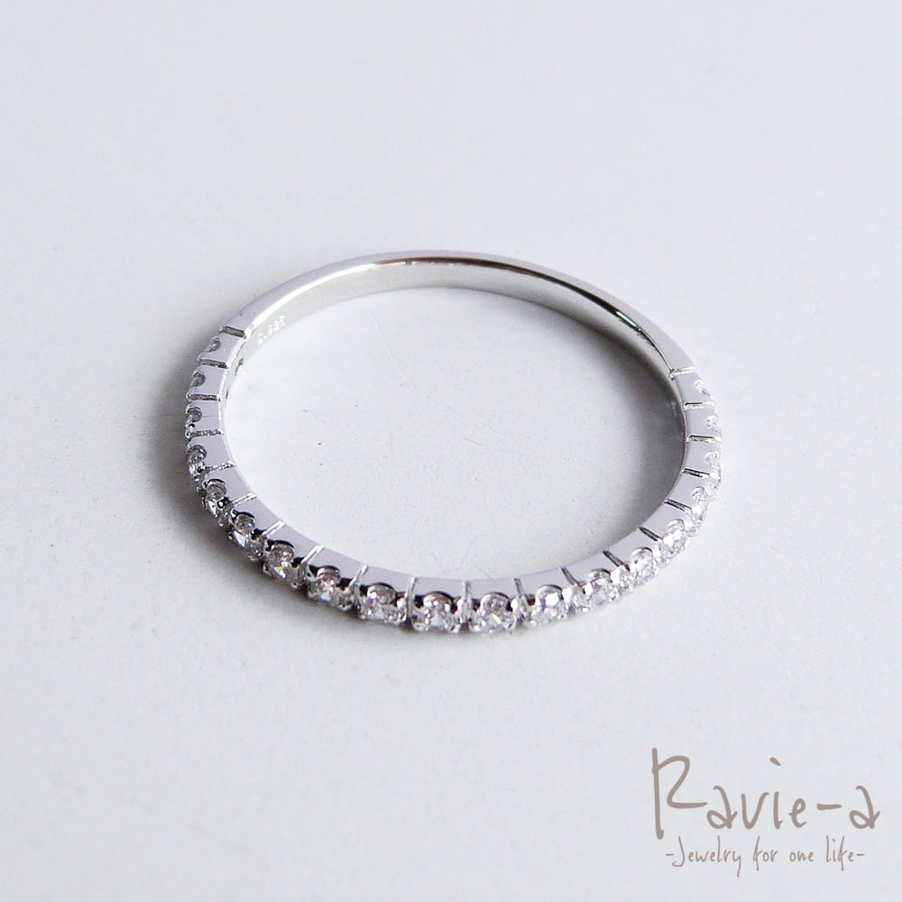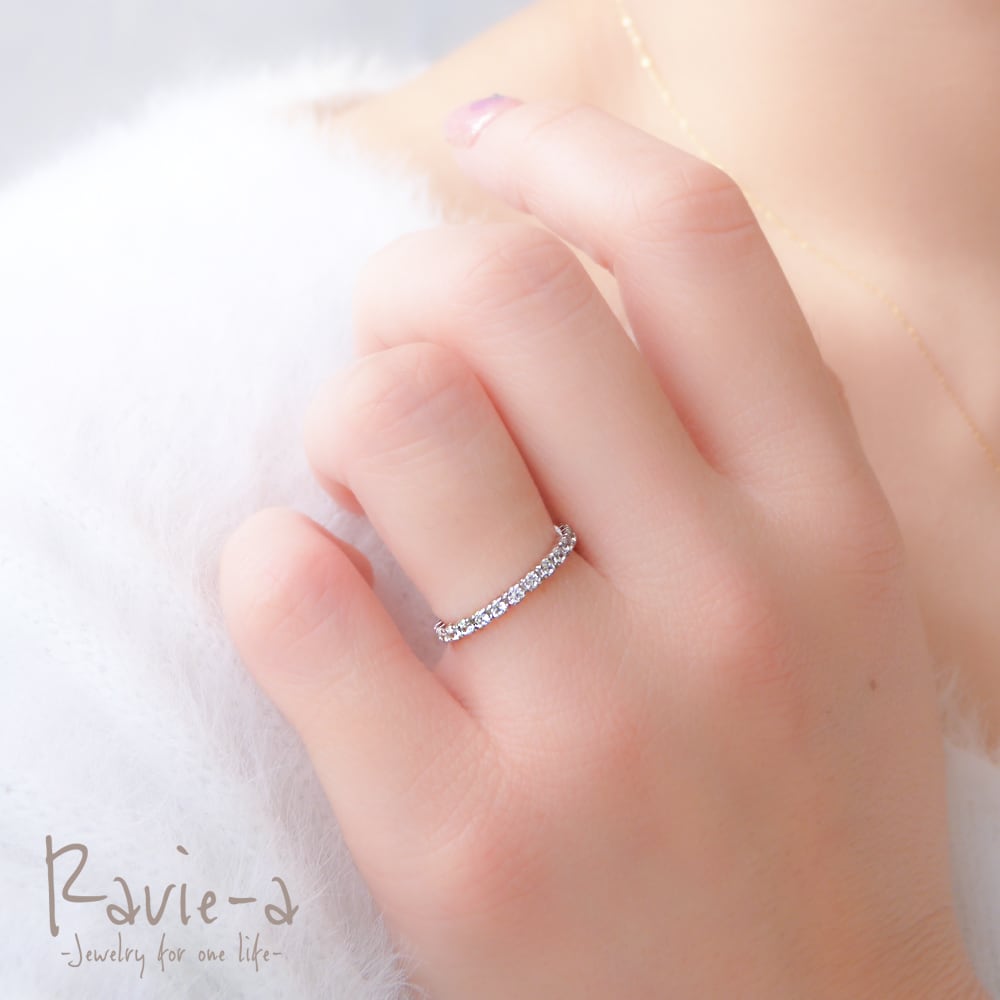 19石のキュービックジルコニアを使用しながらもシンプルでどんなシーンにもマッチする極細エタニティリングでございます。