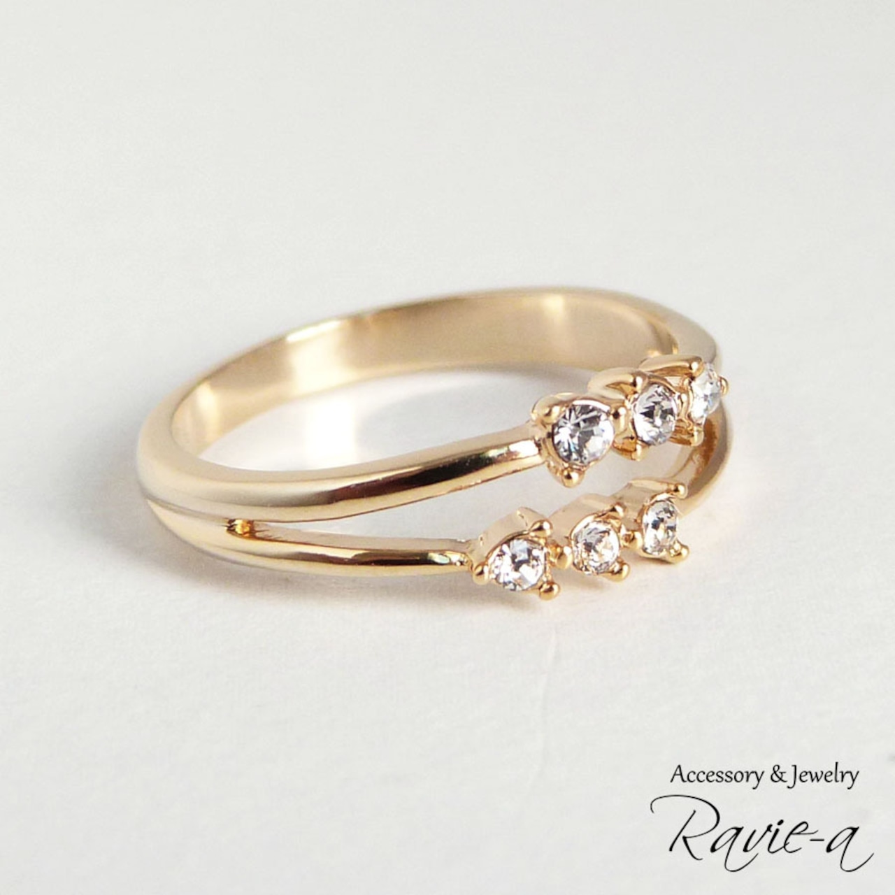 6石のクリスタルが輝く華奢な印象の2連デザインリングでございます。