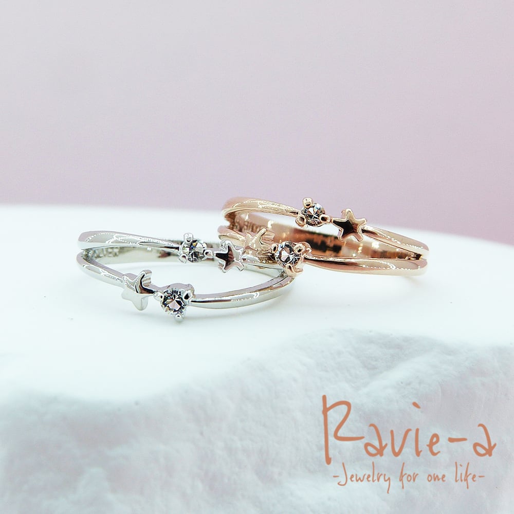 2連デザインにスターモチーフとクリスタルが輝く流れ星のようなウェーブデザインのリングでございます。