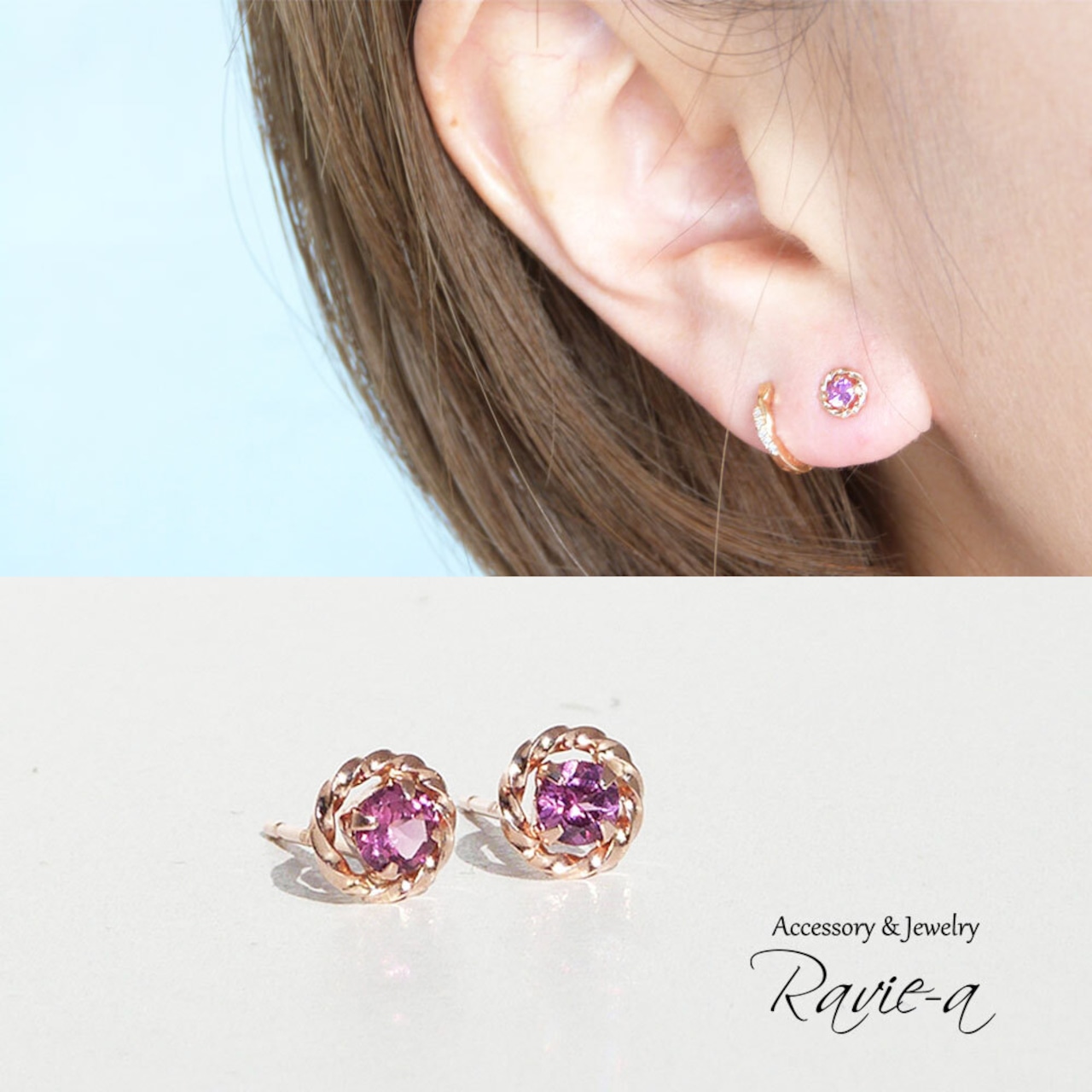 ねじりデザインのK10ピンクゴールド枠に1粒のロードライトガーネット。
