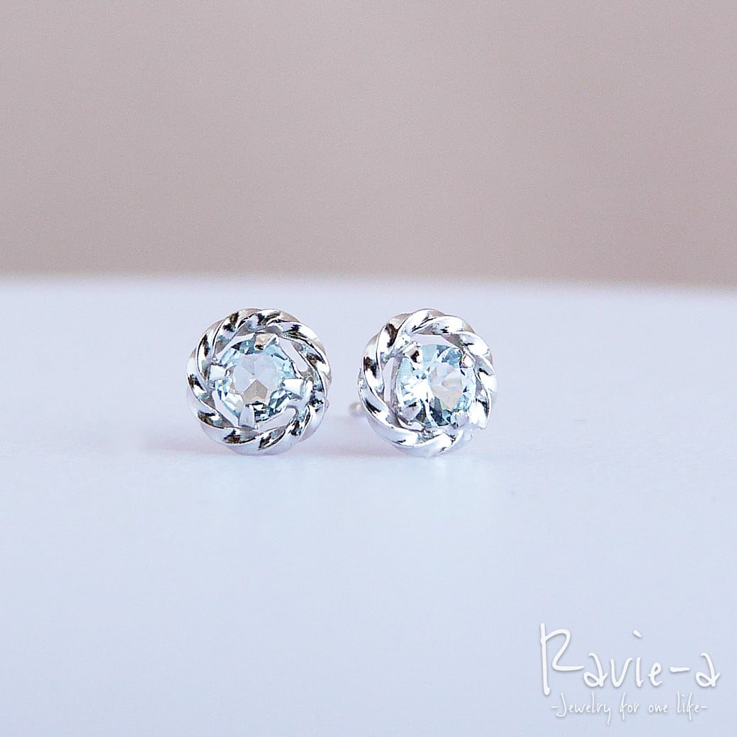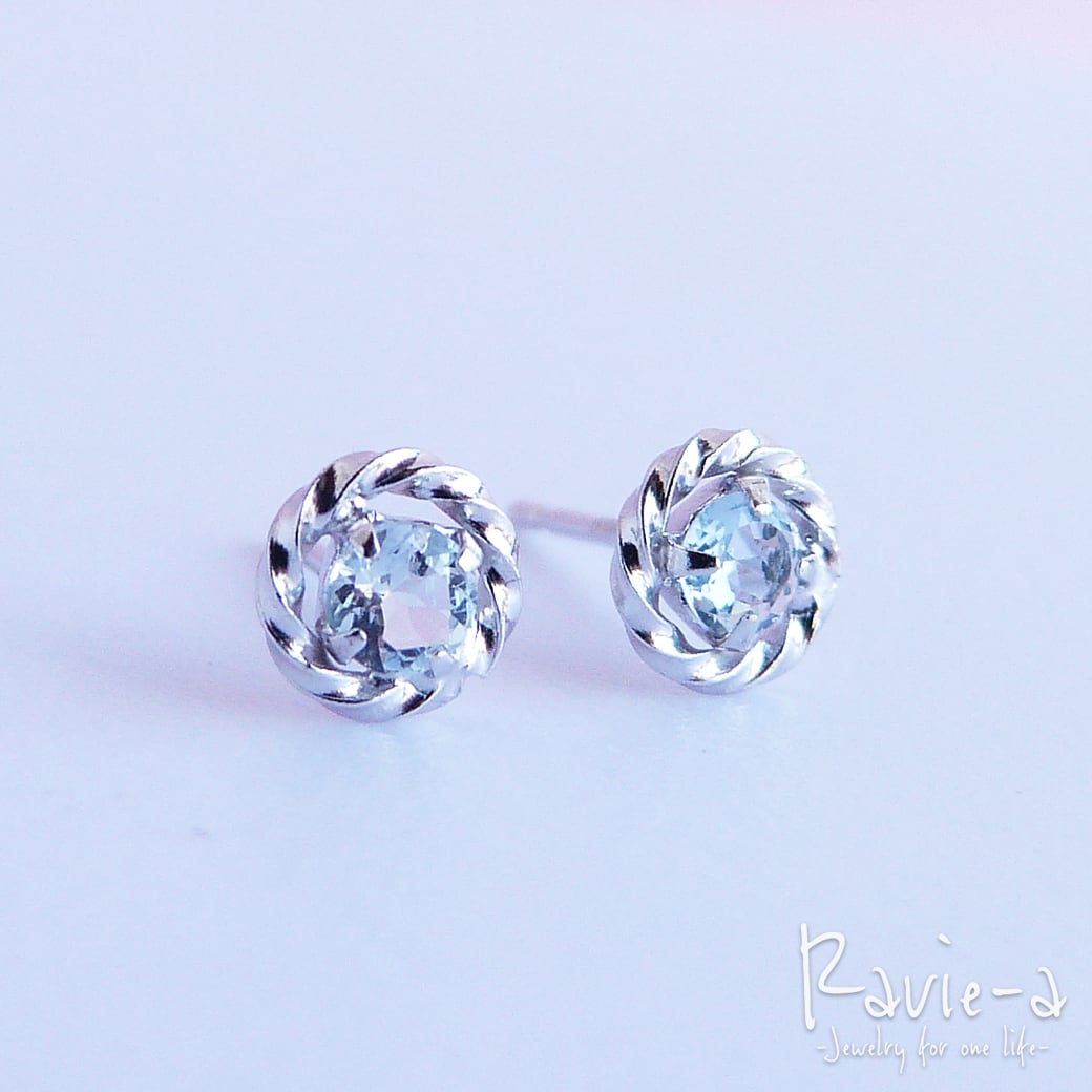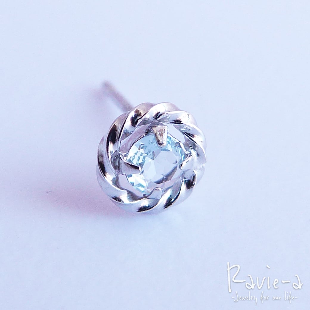 ねじりデザインのK10ホワイトゴールド枠に1粒のアクアマリン。