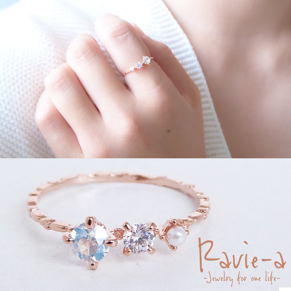 2種類のキュービックジルコニアと小さなフェイクパールが並んだ可愛いリングでございます。